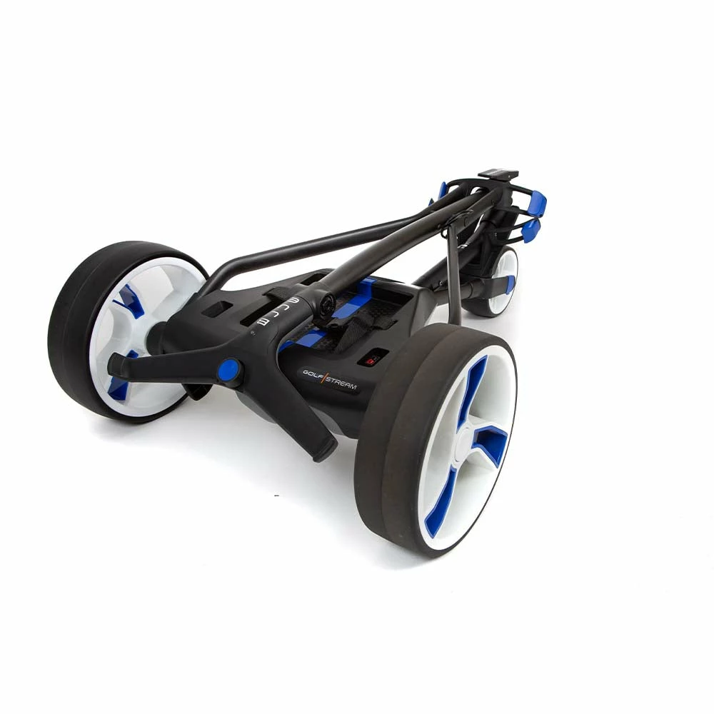Modelled on the best-selling Golfstream VISION, the BLUE offers the same sleek design, super easy erection and fold down but with just an indicator light to show power to the motor and a rotary dial to increase/decrease speed. In truth, just like golf trolleys used to be.